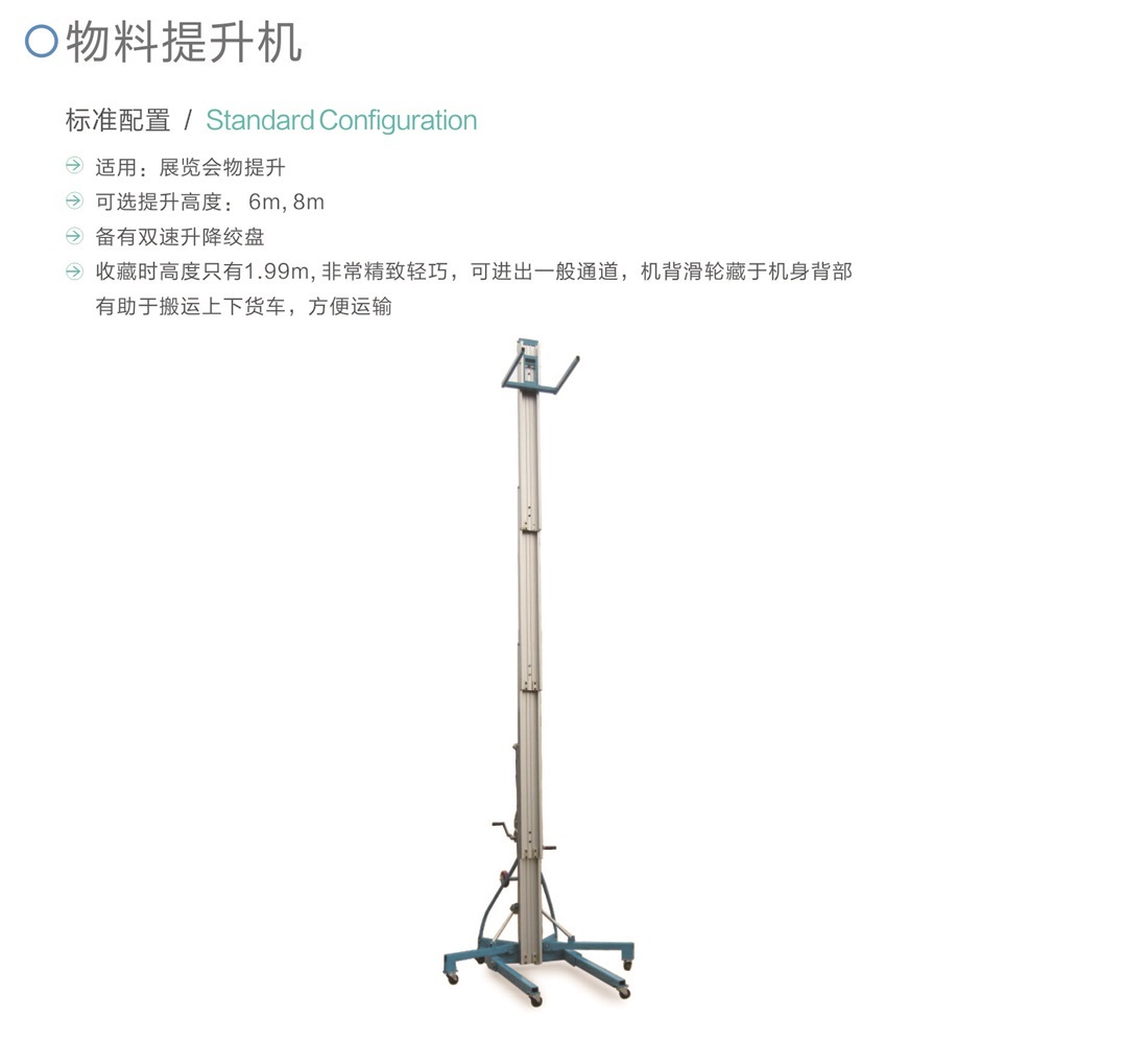 備有雙速升降絞盤收藏時(shí)高度只有1.99m, 非常精致輕巧,可進(jìn)出一般通道,機(jī)背滑輪藏于機(jī)身背部有助于搬運(yùn)上下貨車,方便運(yùn)輸