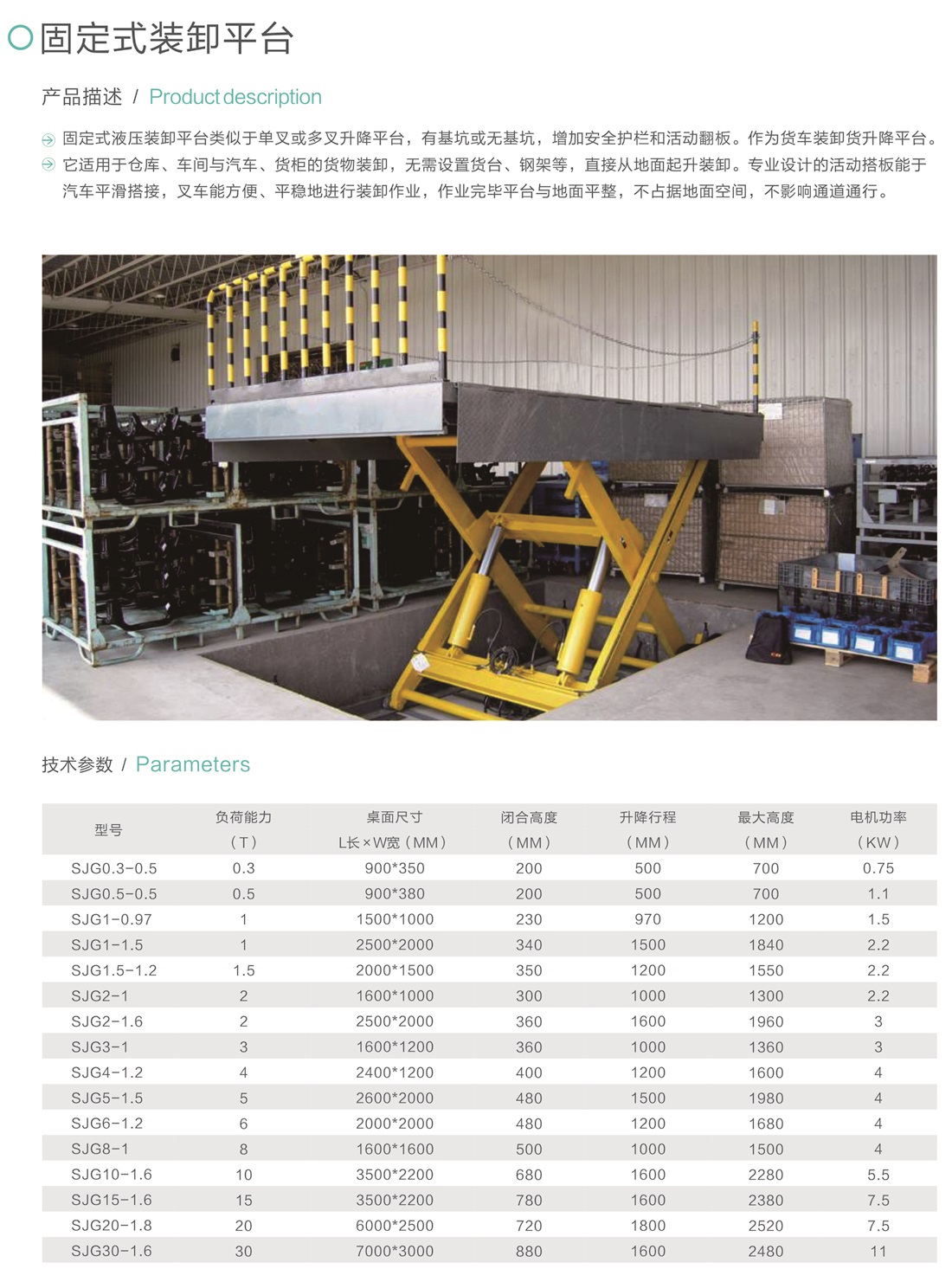 固定式液壓裝卸平臺類似于單叉或多叉升降平臺,有基坑或無基坑,增加安全護(hù)欄和活動翻板。作為貨車裝卸貨升降平臺。