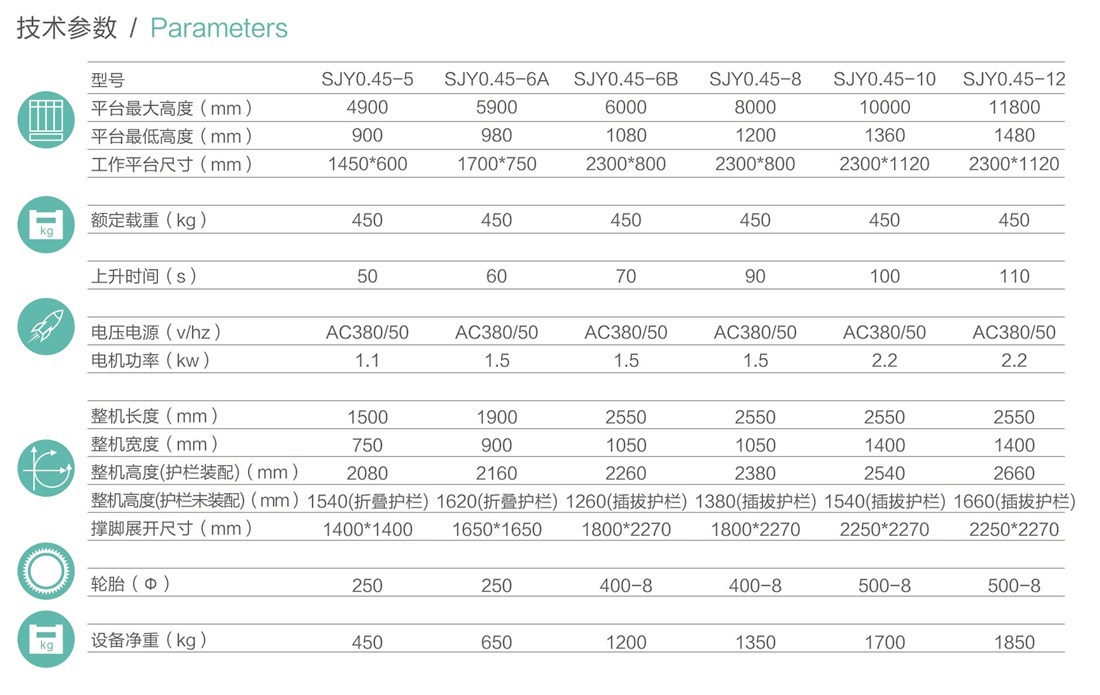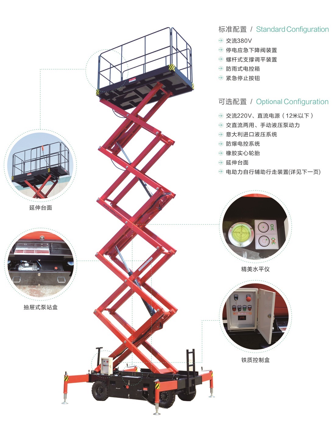 采用寬截面錳鋼矩形管,運(yùn)行更加平穩(wěn)、可靠點(diǎn)動(dòng)控制升降,平臺(tái)上下雙向控制升降控制電壓為直流24V,保證操作人員的安全帶有應(yīng)急下降裝置,在突然斷電時(shí),可安全下降電氣控制系統(tǒng)設(shè)有雙接觸器、雙限位開關(guān),底盤設(shè)置可外拉式活動(dòng)抽屜,檢修方便,底盤設(shè)置標(biāo)準(zhǔn)運(yùn)輸叉車孔