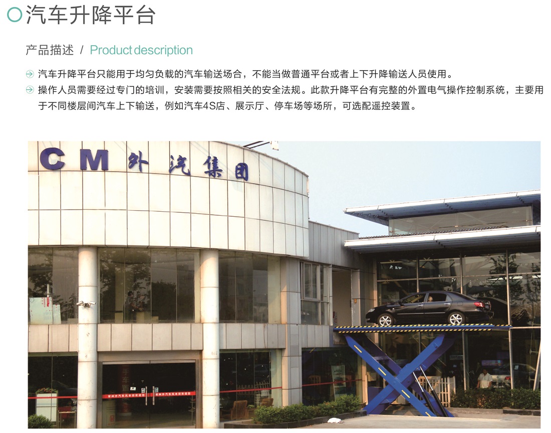操作人員需要經過專門的培訓,安裝需要按照相關的安全法規。此款升降平臺有完整的外置電氣操作控制系統,主要用于不同樓層間汽車上下輸送,例如汽車4S店、展示廳、停車場等場所,可選配遙控裝置。