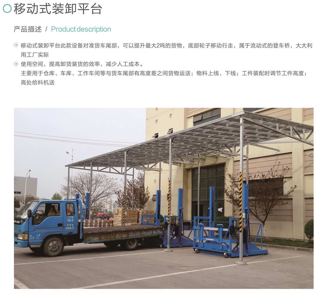 移動式裝卸平臺此款設備對準貨車尾部,可以提升最大2噸的貨物,底部輪子移動行走,屬于流動式的登車橋,大大利用工廠實際使用空間,提高卸貨裝貨的效率,減少人工成本。